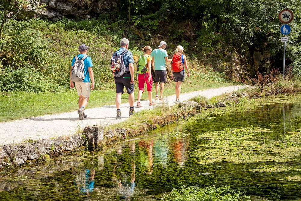 Nach diesem Gefühlsgipfel folgt mit der Wimsener Höhle auch schon das nächste Highlight. Mit dem Boot gleitet man über türkis schimmerndes Wasser zwischen mystischen Steinwänden – ein einzigartiges Naturerlebnis, das es nur hier gibt. Direkt neben der Höhle befindet sich der Bio-Gasthof Friedrichshöhle, der mit leckeren und regionalen Spezialitäten zur Einkehr in traumhafter Kulisse einlädt. Durch Wimsen führt der Wanderweg weiter durch ein wildromantisches Tal Richtung Gossenzugen, wo ein gemütliches Bänkchen und eine Grillstelle zum Verweilen einladen. Zum Abschluss belohnt der Aussichtspunkt in Gossenzugen, mit weiter Sicht auf Zwiefalten und dessen spätbarockes Münster, bevor die Wanderung sich gemächlich dem Ende neigt.