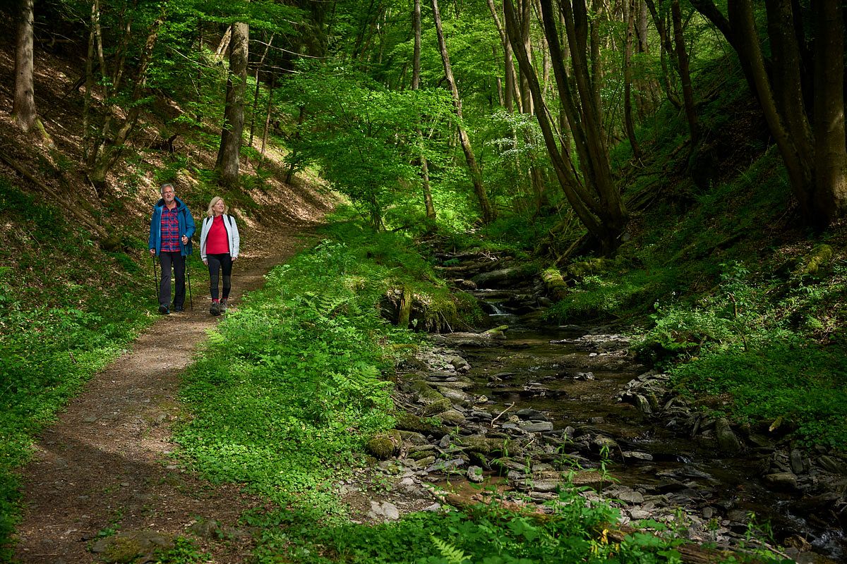 Der anschließende Abstieg erfordert Trittsicherheit, doch die Rast in der Wanderhütte belohnt mit neuer Kraft, bevor eine weite Schleife ins Tal führt. Auf dem schmalen Pfad am Wasser entlang entfaltet sich eine romantische, verwunschene Stimmung, die das Fließen des Wassers und das sanfte Rauschen des Geländes spürbar macht. Der anschließende Feldweg hin zum Altlayer Bachtal lässt ein ruhiges, offenes Landschaftsbild entstehen, in dem sich Weite und Intimität der Natur begegnen.