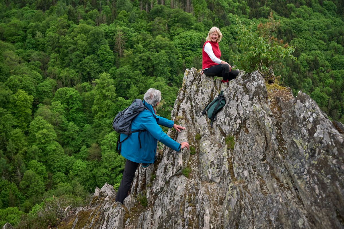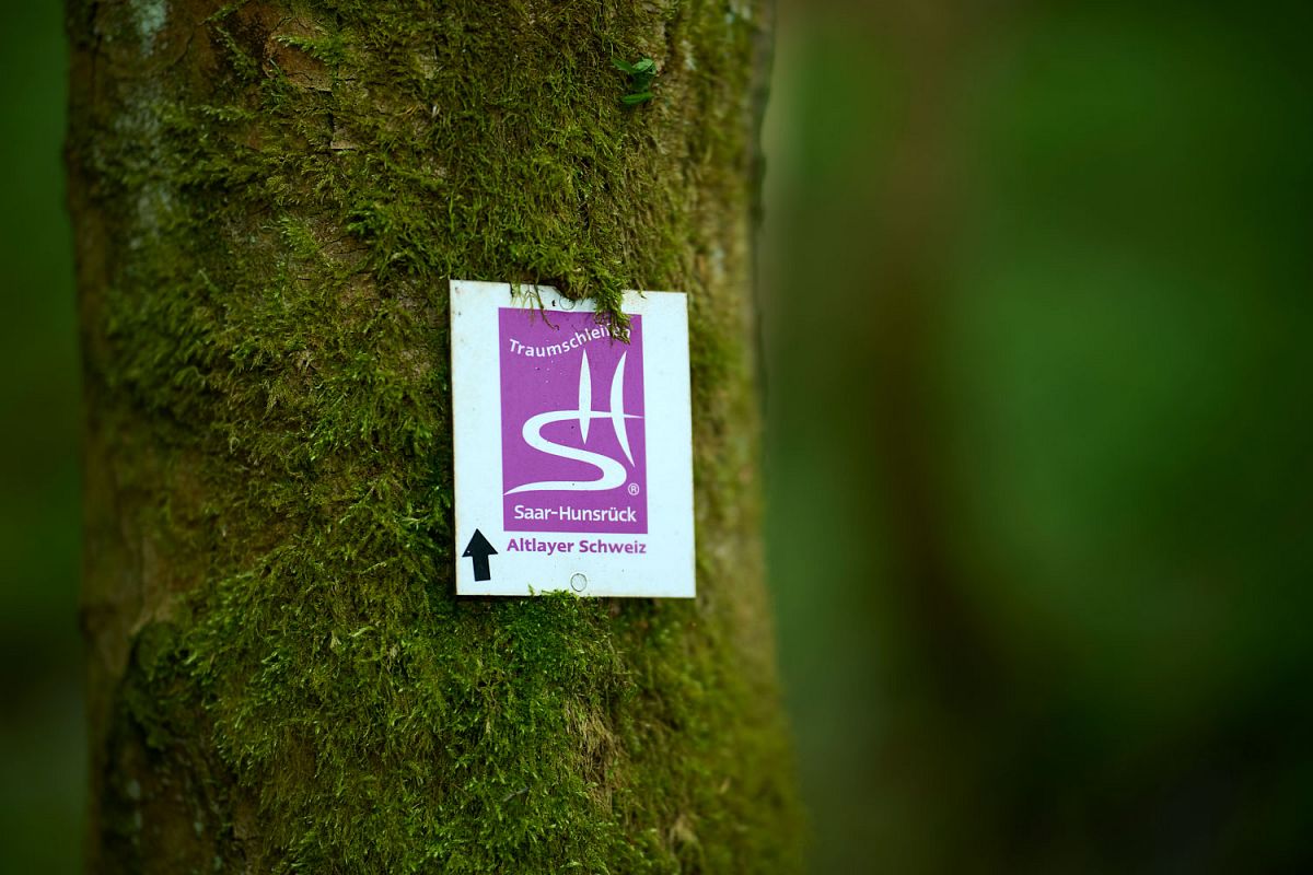 Der Weg Altlayer Schweiz ist der schönste Weg, weil er eine finale Harmonie aus Natur, Aussicht und Kultur vereint. Von Beginn an führt ein alter, grasbewachsener Wirtschaftsweg in eine imposante Felspassage, wo sich von schroffen Schieferfelsen aus atemberaubende Blicke ins tief eingeschnittene Hitzelbachtal eröffnen. Die bizarren Kronen- und Stammformen der Eichen setzen eine einzigartige, fast skulpturale Atmosphäre.