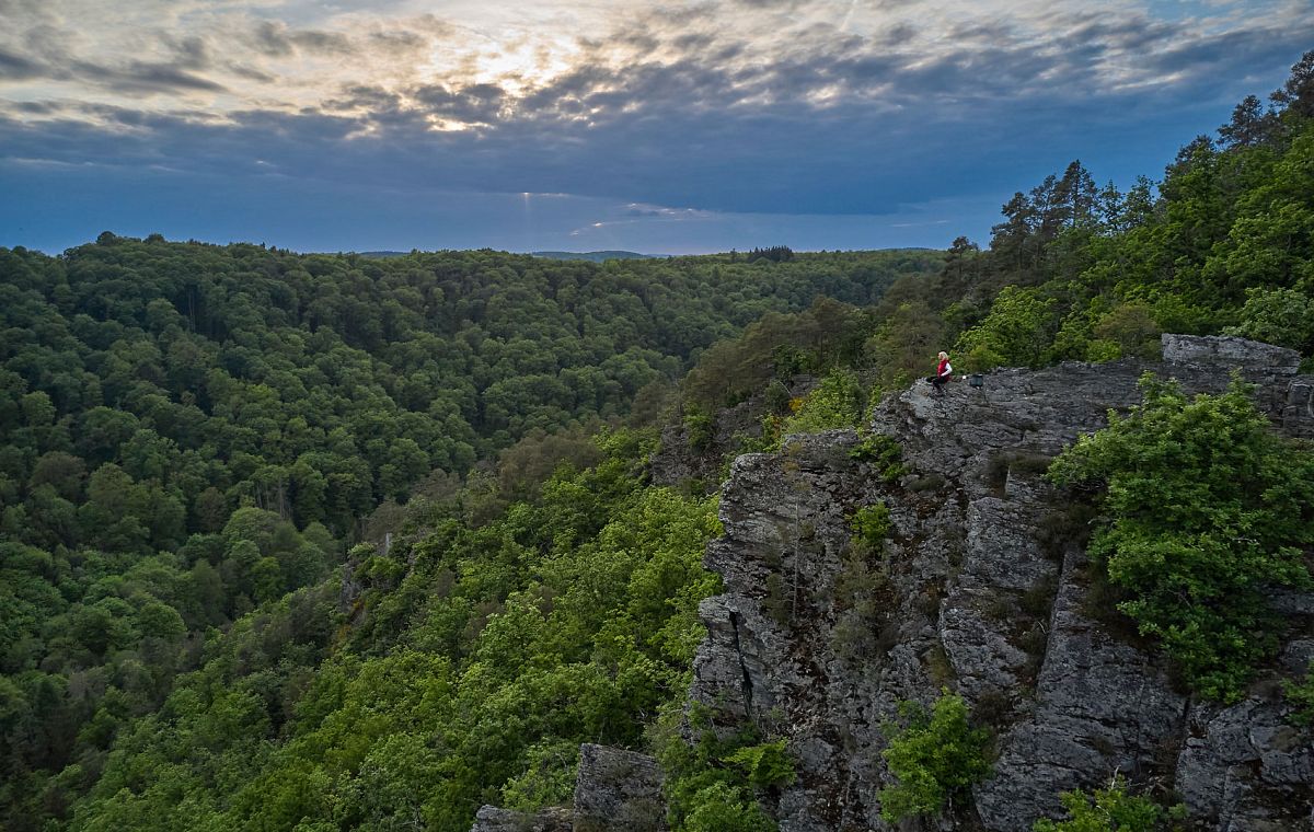 Eine kurze, gesicherte Kletterpassage öffnet den Weg zu einem alten Waldweg, gefolgt von aufsteigenden Abschnitten durch offenen Laubwald. Infotafeln vermitteln kulturhistorische Tiefe und verankern das Erleben inregionaler Geschichte. Der höchste Punkt mit knapp 400 Metern bietet erneut einen grandiosen Panoramablick, während die Wellenliege einen weiten Fernblick über offenes Feldland ermöglicht.